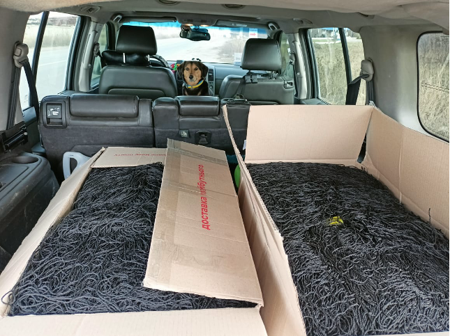 One day this spring we were driving to deliver a car to one of the military units north of Kharkiv with which we work. At the checkpoint the guard commented about the exposure of this checkpoint to enemy drone attacks. The frontline is not far so the attacks are very frequent. This means that civilians driving through there are exposed. Indeed, as we were able to see the traffic on this checkpoint is very heavy and in the past the checkpoint was hit several times, with people wounded and cars damaged. We got the contact of the unit at this checkpoint and soon our car was loaded with 300 m2 of anti-drone nets to protect this checkpoint. (photo above)